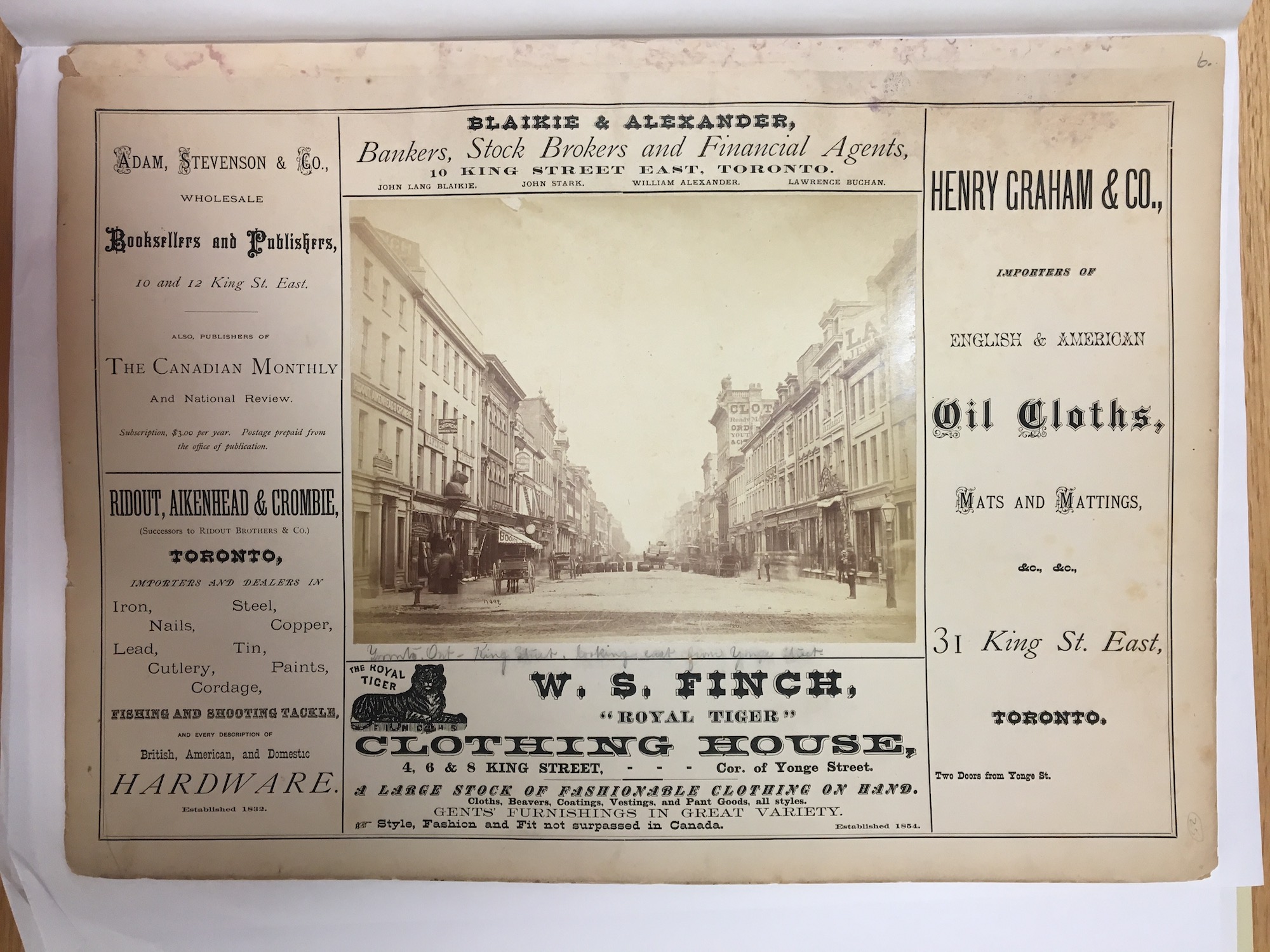 Notman & Fraser, "[Toronto, Ont. King Street, looking east from Yonge Street]," in the collection of Archives of Ontario. Nineteenth-century Canadian Photographically Illustrated Books, accessed March 11, 2026, https://canadianphotographicallyillustratedbooks.com/omeka/items/show/1276.