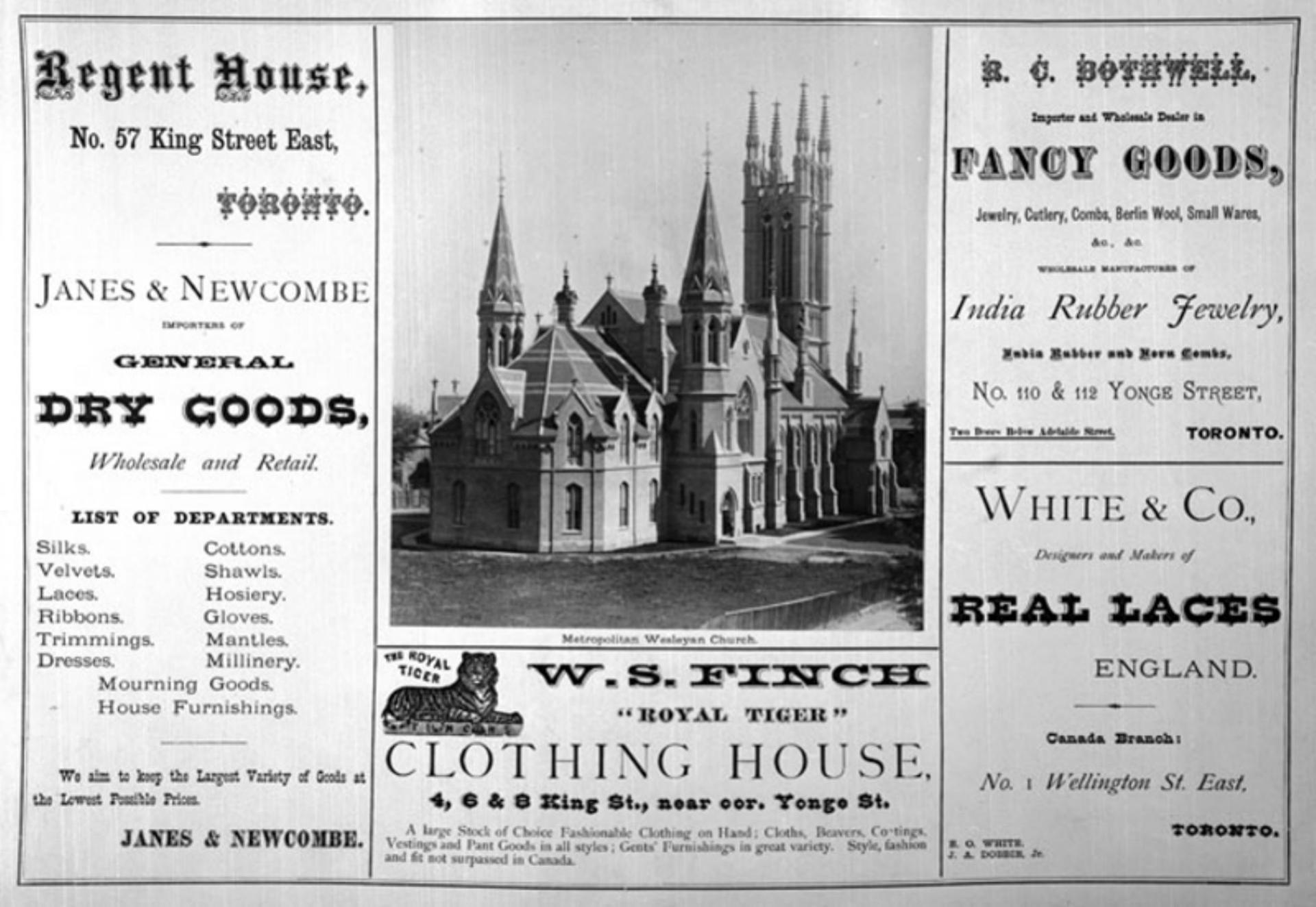 Notman & Fraser, "Metropolitan Wesleyan Church and stores," in the collection of Toronto Public Library, OHQ-BOOKS-S-W-111. Nineteenth-century Canadian Photographically Illustrated Books, accessed March 11, 2026, https://canadianphotographicallyillustratedbooks.com/omeka/items/show/1371.