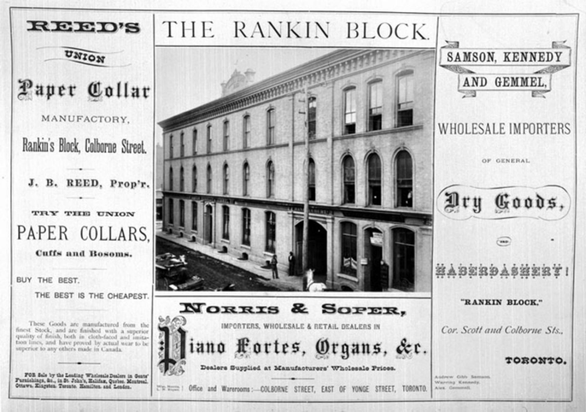 Notman & Fraser, "The Rankin Block, Colborne Street," in the collection of Toronto Public Library, OHQ-BOOKS-S-W-160. Nineteenth-century Canadian Photographically Illustrated Books, accessed March 11, 2026, https://canadianphotographicallyillustratedbooks.com/omeka/items/show/1374.