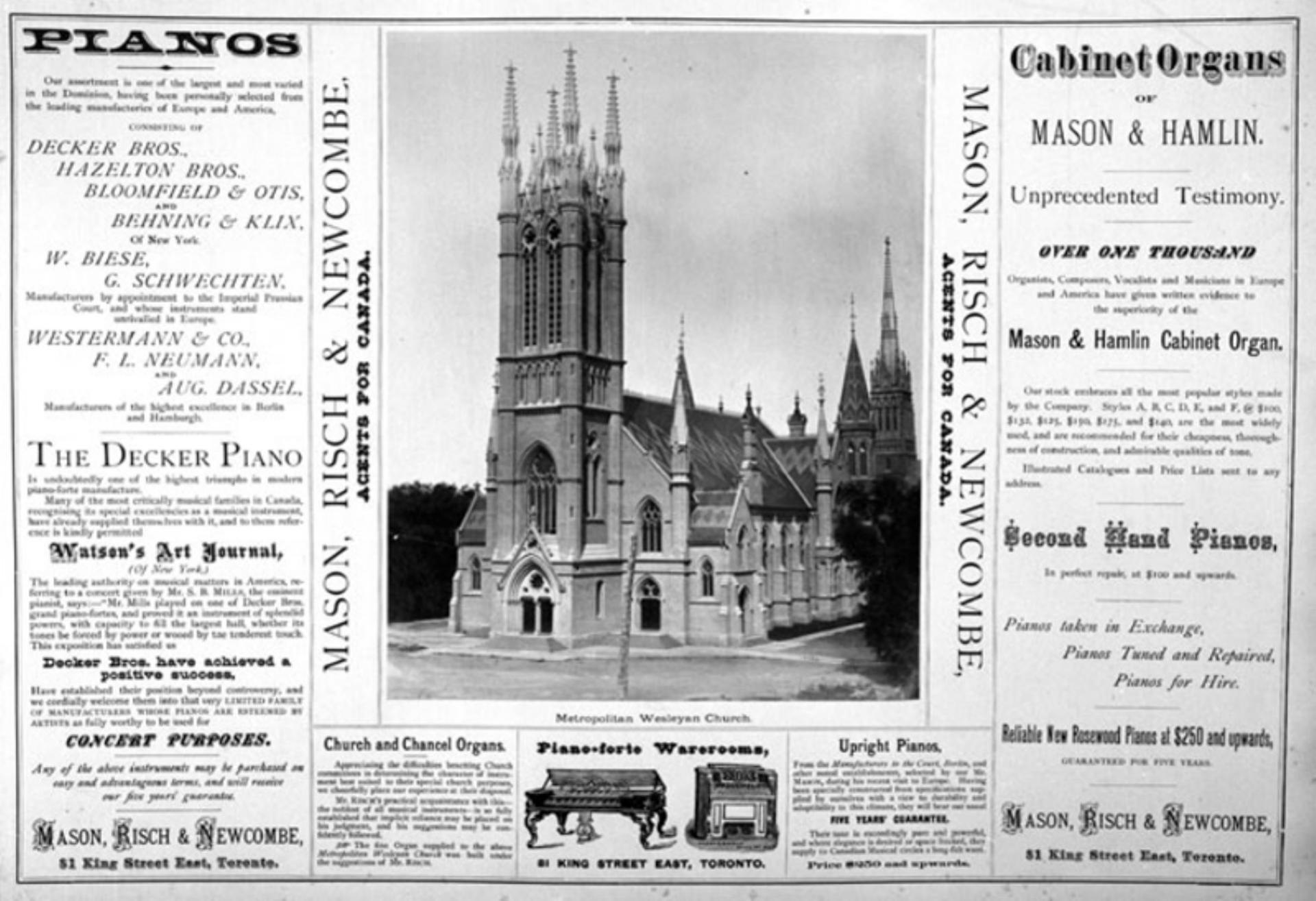 Notman & Fraser, "Metropolitan Wesleyan Church and Mason, Risch and Newcombe," in the collection of Toronto Public Library, OHQ-BOOKS-S-W-176. Nineteenth-century Canadian Photographically Illustrated Books, accessed March 11, 2026, https://canadianphotographicallyillustratedbooks.com/omeka/items/show/1382.