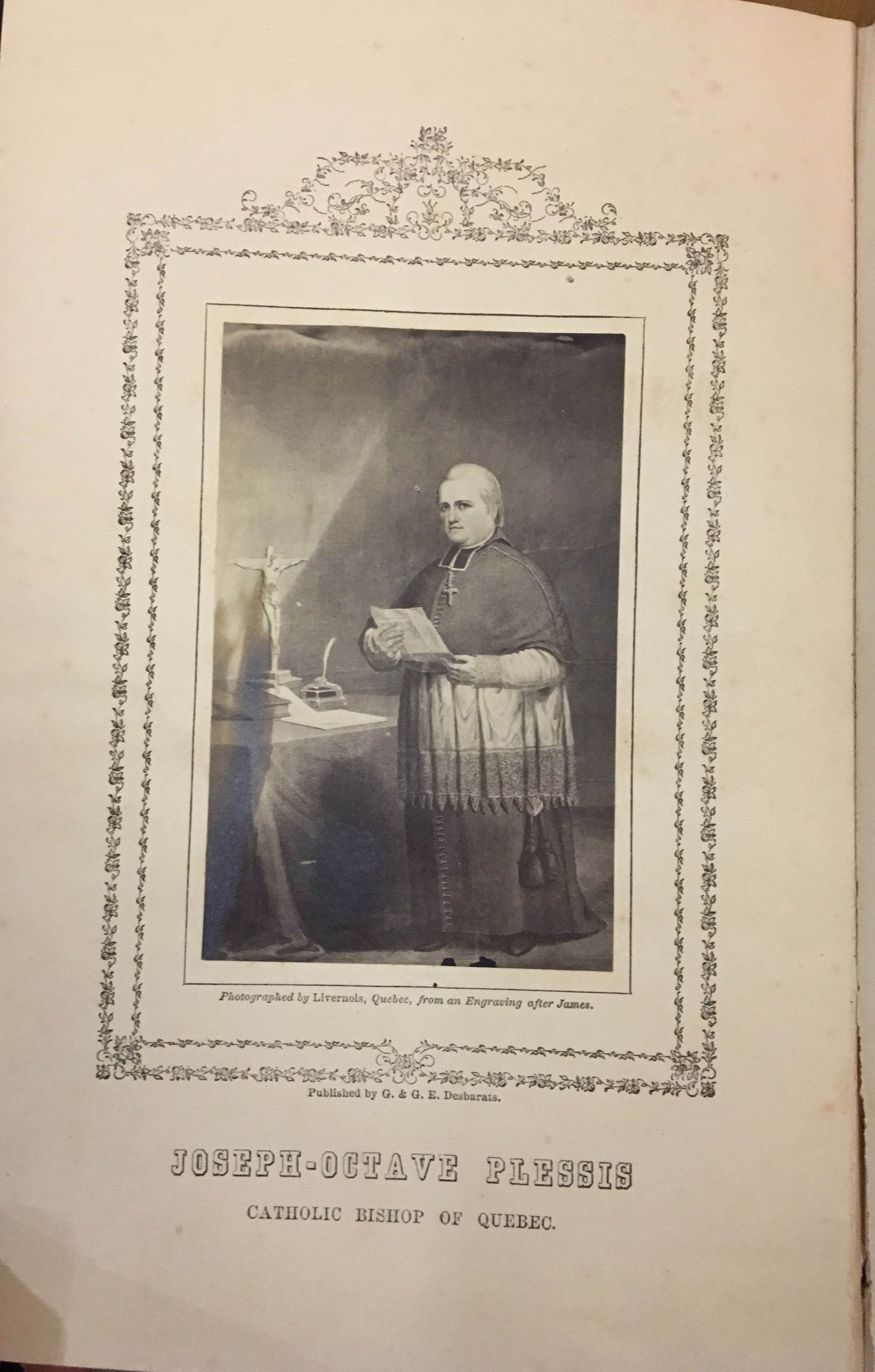 J. B. (Jules Benoît) Livernois (1830-1865), "Joseph-Octave Plessis, Catholic Bishop of Quebec," in the collection of McGill University Library Rare Books and Special Collections, BX4705 P65 F42. Nineteenth-century Canadian Photographically Illustrated Books, accessed March 11, 2026, https://canadianphotographicallyillustratedbooks.com/omeka/items/show/1451.